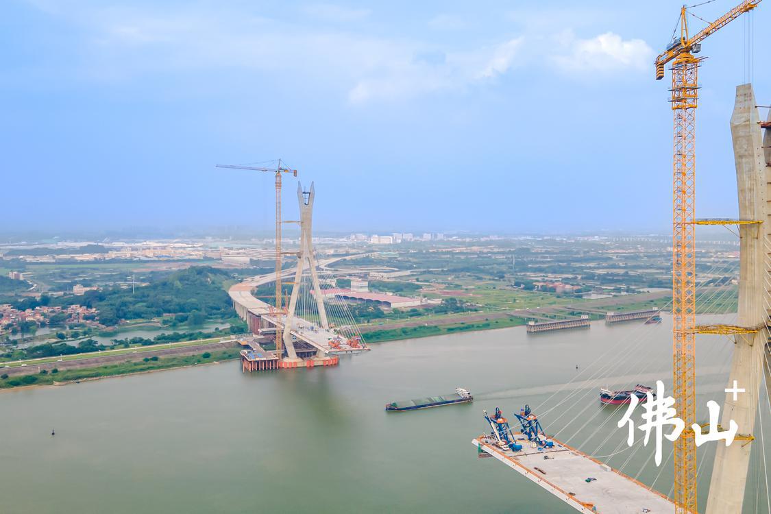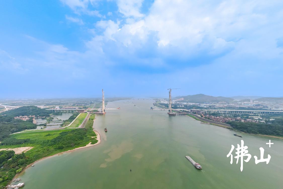 吊臂运转,机械轰鸣,6月13日下午,三水区白坭镇龙池村外的佛山市富龙西江特大桥施工现场,工人们正热火朝天地抢抓进度。借助无人机从高空俯瞰,西江航道上万顷碧波,两岸的桥塔犹如一双白鹭隔江相望,而桥梁在建部分宛如两把出鞘的利剑从江岸向对岸延伸,看起来分外雄壮。