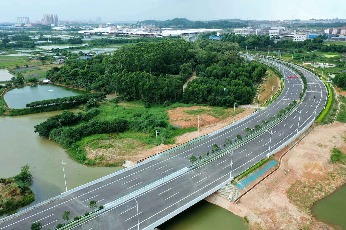 金石大道西延线工程路线起点接南海区金石大道,呈东往西走向,经过大岗顶,接现状三水区金乐路(金港路),路线全长1.612km。采用一级公路标准兼顾城市道路功能建设,设计车速为60km/h,双向六车道,全线设中桥1座,涵洞2道,平面交叉2处。