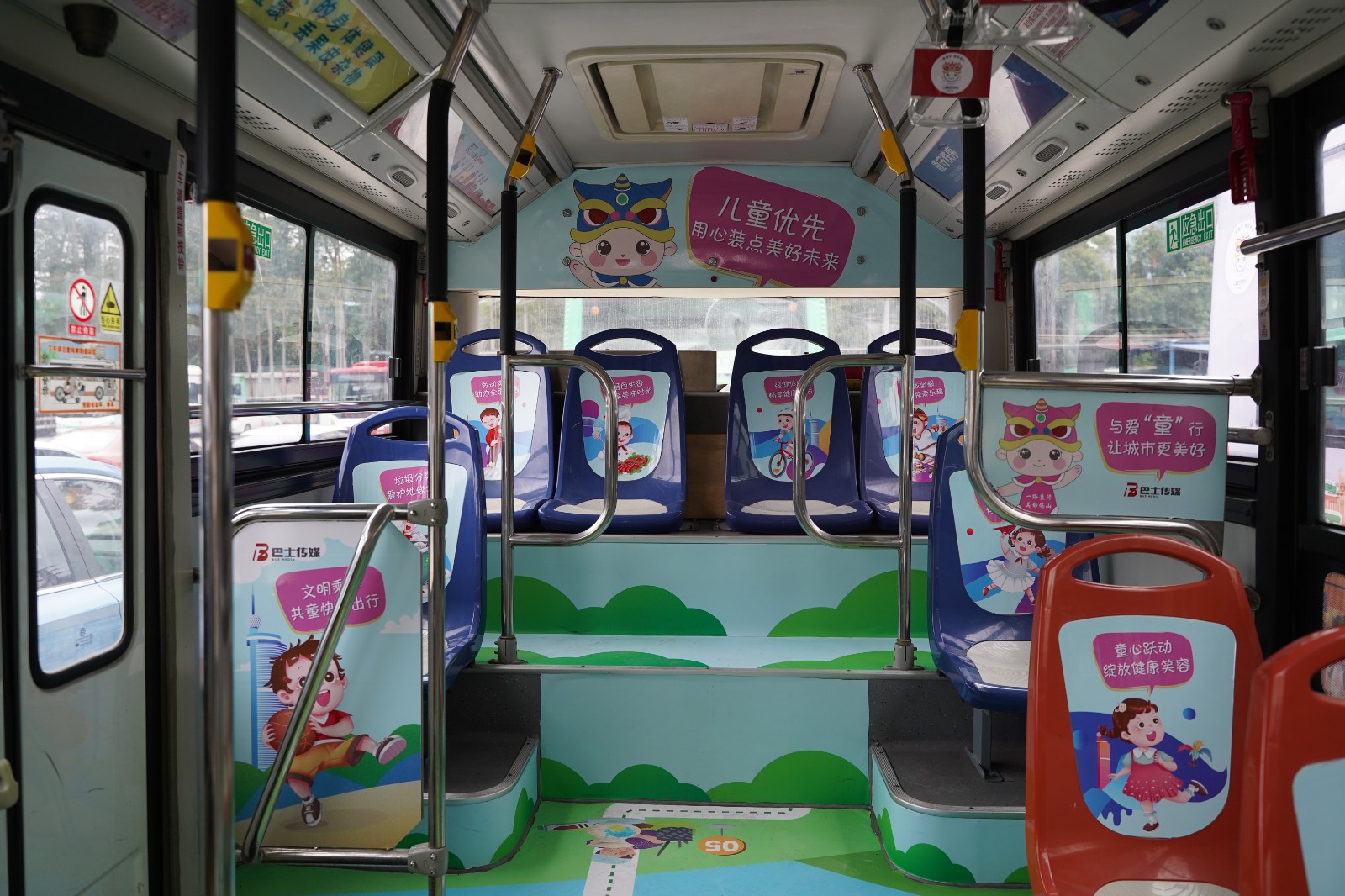 为更好守护儿童,主题公交选定了途经学校、社区、公园与文化场所的线路,以可爱为风格基调装扮小巴车,以清新配色、充满童趣的视觉效果和简洁的文明友好口号教育引导儿童文明行为和引导家长和社会对儿童的关爱,营造一个轻松有意义的童趣车厢。
